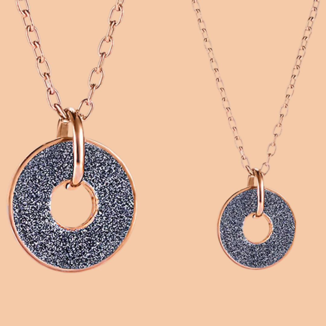 Dieses elegante Collier aus grauem Edelstahl besticht durch eine zarte Rosévergoldung, die dem Schmuckstück einen warmen Schimmer verleiht. Mit einer Länge von ca. 60 cm trägt es sich bequem und fällt durch seinen dezenten Sternenglanz, aus schwarzem Mineralienstaub mit kleinen Diamantsplittern, besonders edel auf. Perfekt für anspruchsvolle Looks, die zeitlose Raffinesse ausstrahlen.